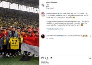 Dalam unggahan Instagram pribadinya, @gianni_infantino. Dia juga berharap Piala Dunia U-17 2023 bisa mempersatukan bangsa-bangsa. Pemain-pemain muda ini juga diyakini akan menjadi bintang sepakbola masa depan.