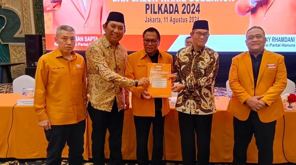 Penyerahan surat keputusan (SK) untuk Paslon Hapal diberikan langsung Ketum Hanura Oesman Sapta Odang di Jakarta, Ahad (11/8/2024).